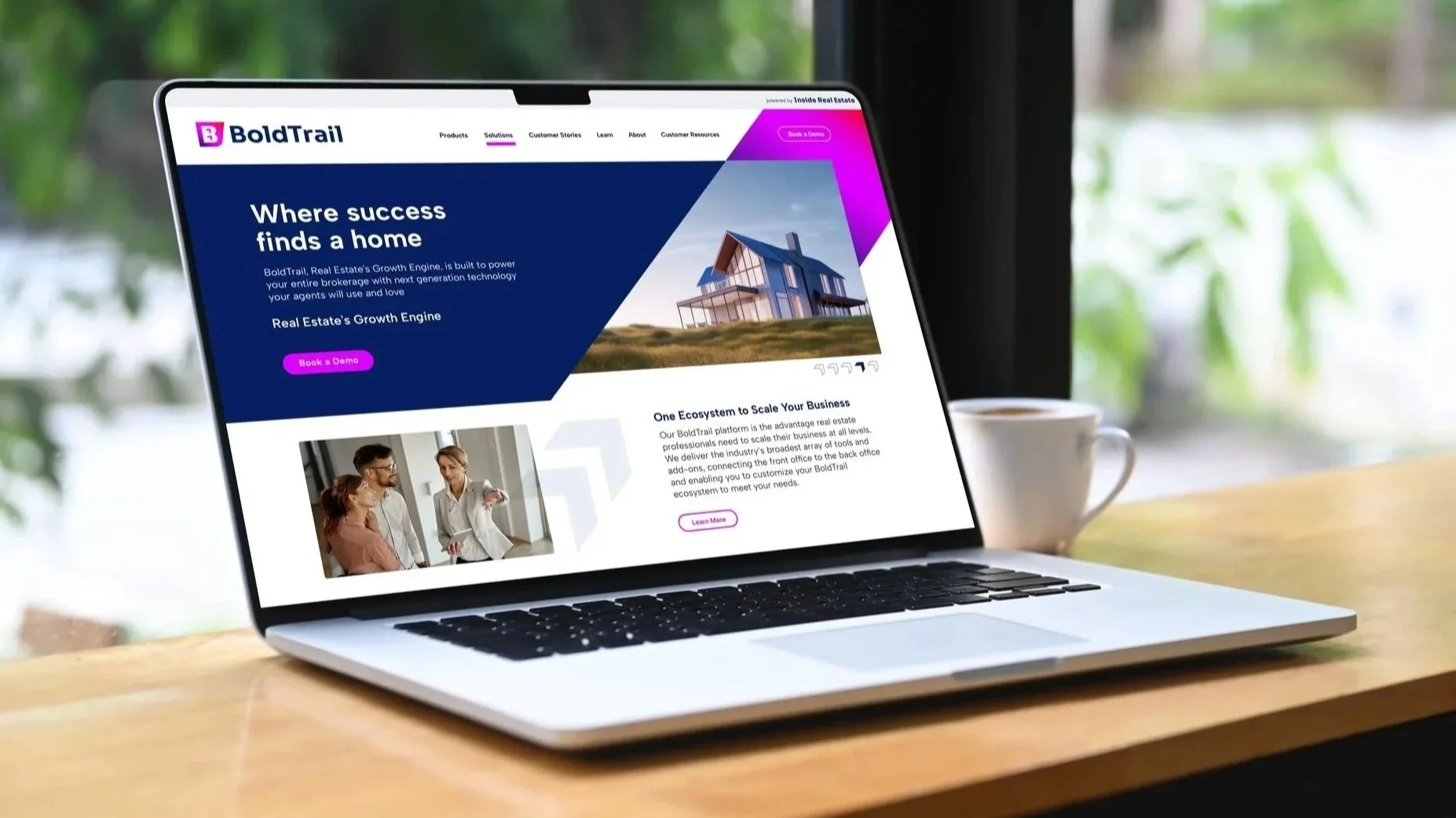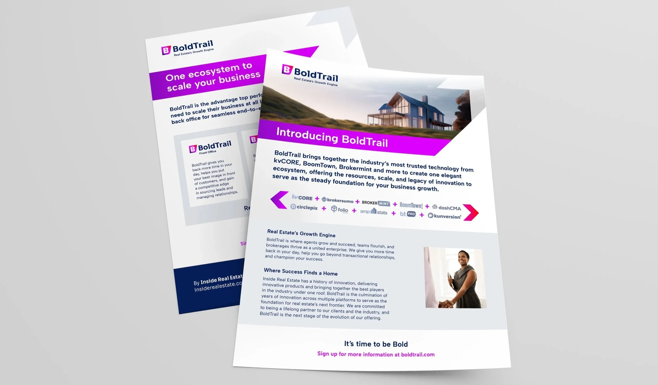 The name, “BoldTrail,” highlights how the combined organizations have built the industry’s most comprehensive end-to-end real estate technology ecosystem. The visual brand identity emphasizes progress and growth, represented by the bright gradient and the directional arrow counter shapes in the Bold B logo. In addition to wayfinders, these shapes evoke 3D shadows of windows or doorways and are also reminiscent of moving boxes, all of which are a nod to the real estate industry.