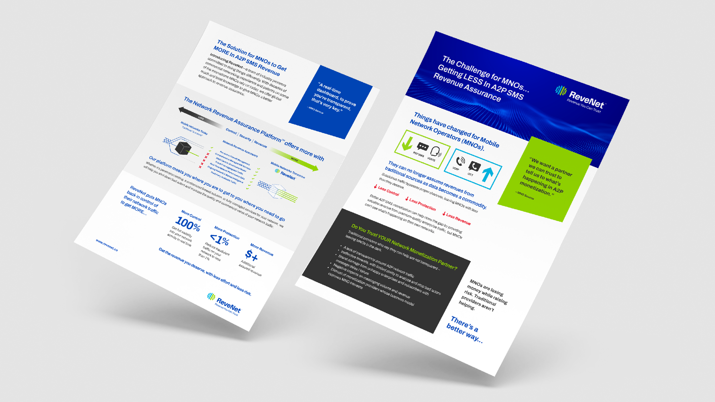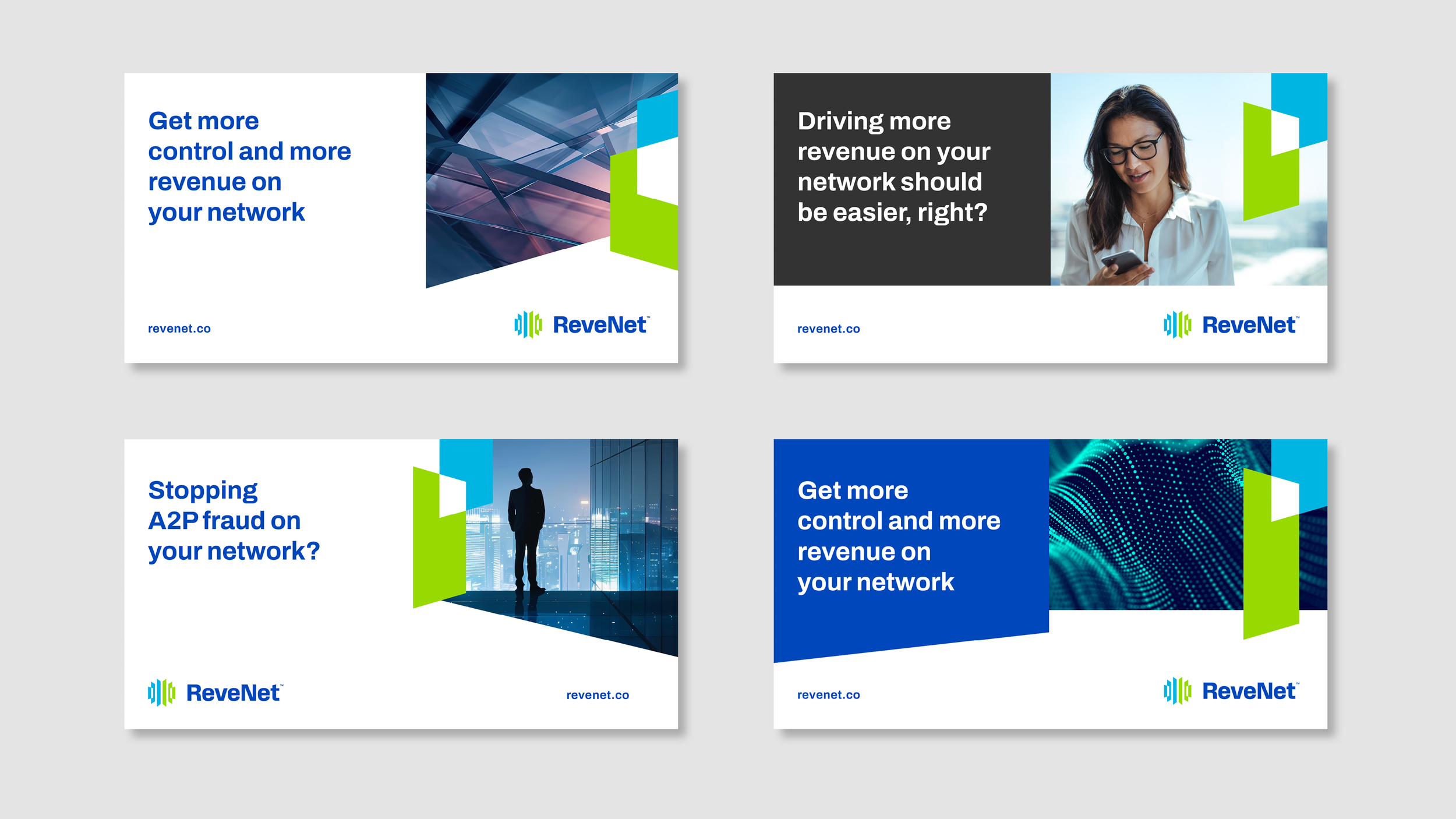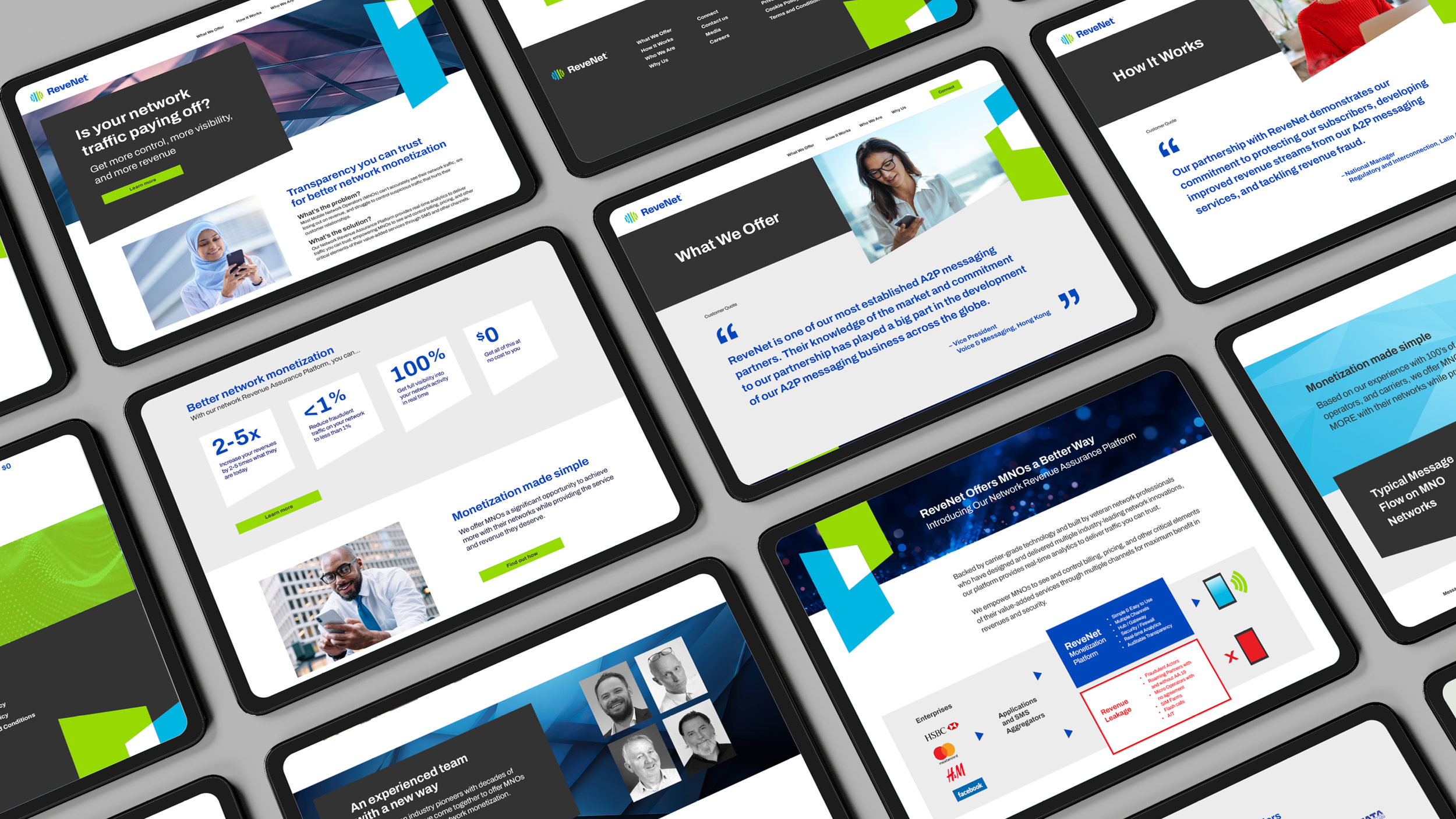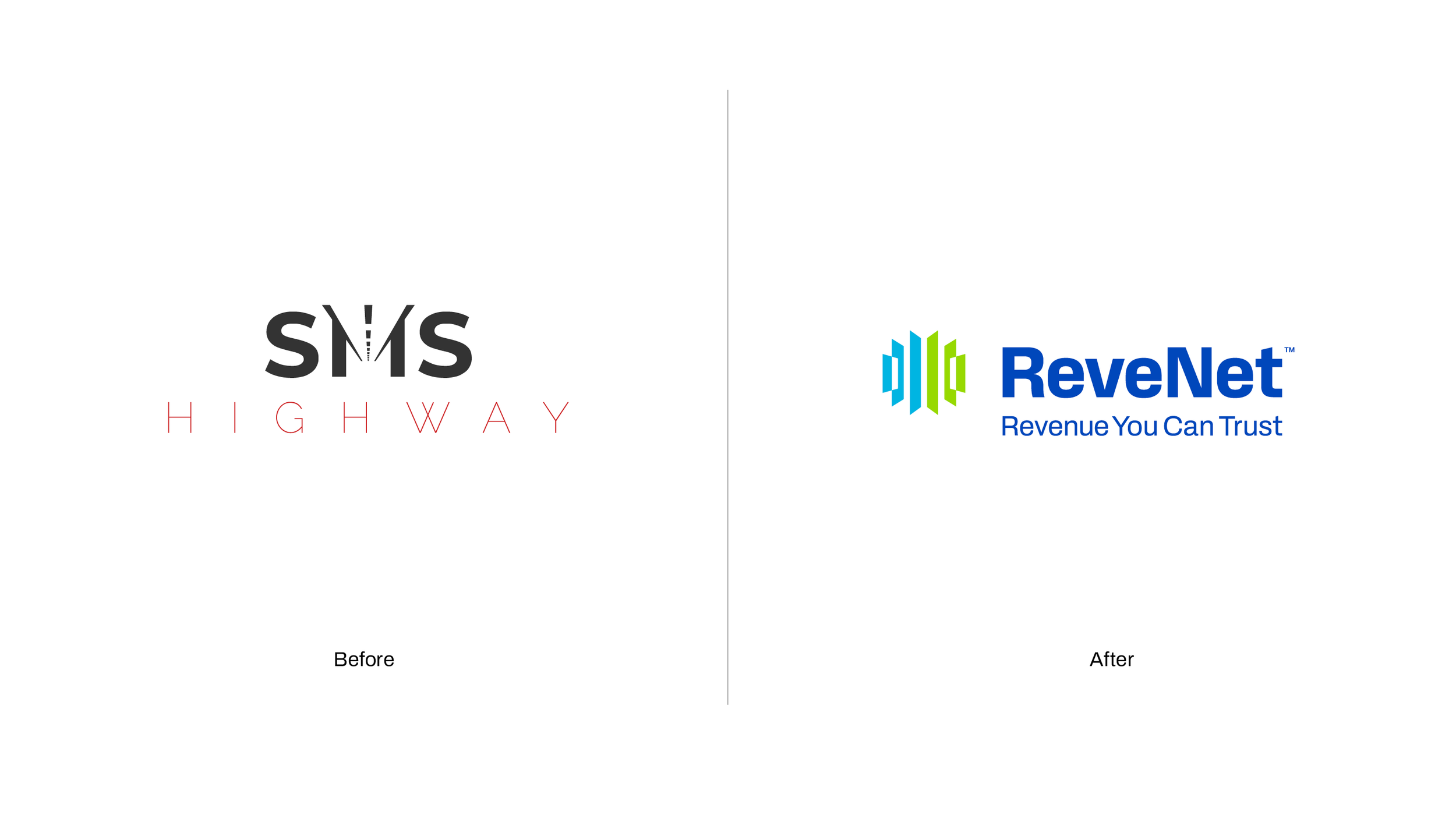 SMS Highway adopted a message platform focused on transparency, solutions tailored to the needs of MNOs, and simplicity. A new name, ReveNet, combined the words “revenue” and “network” and signaled the return of lost revenue to mobile networks. A dynamic, tech-forward logo and visual identity were developed along with a suite of communication tools, including a company overview deck, brand video, digital campaign, and sales materials. Repetition of angles evokes the former SMS logo and emulates scale, revenue and progress.
