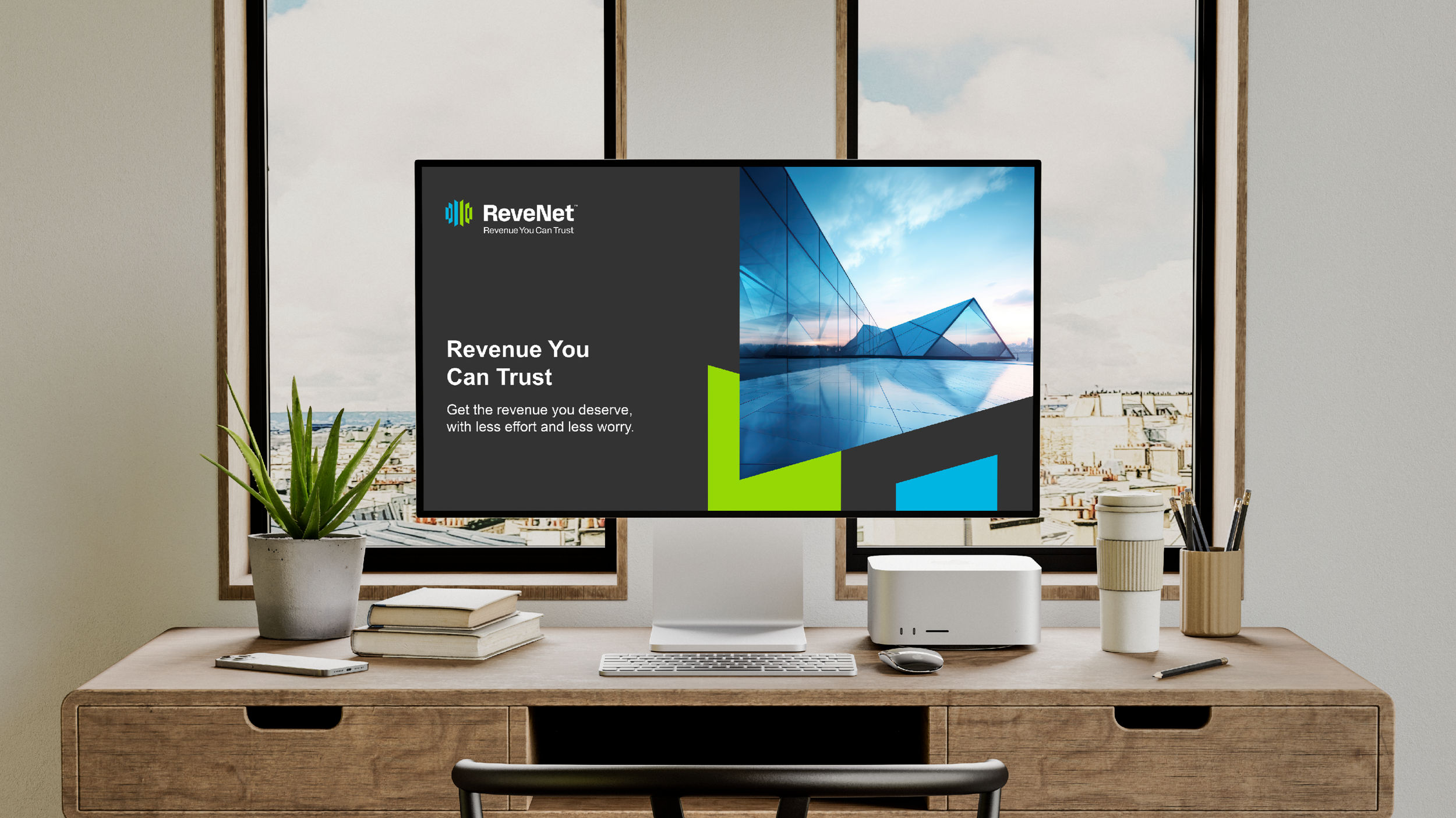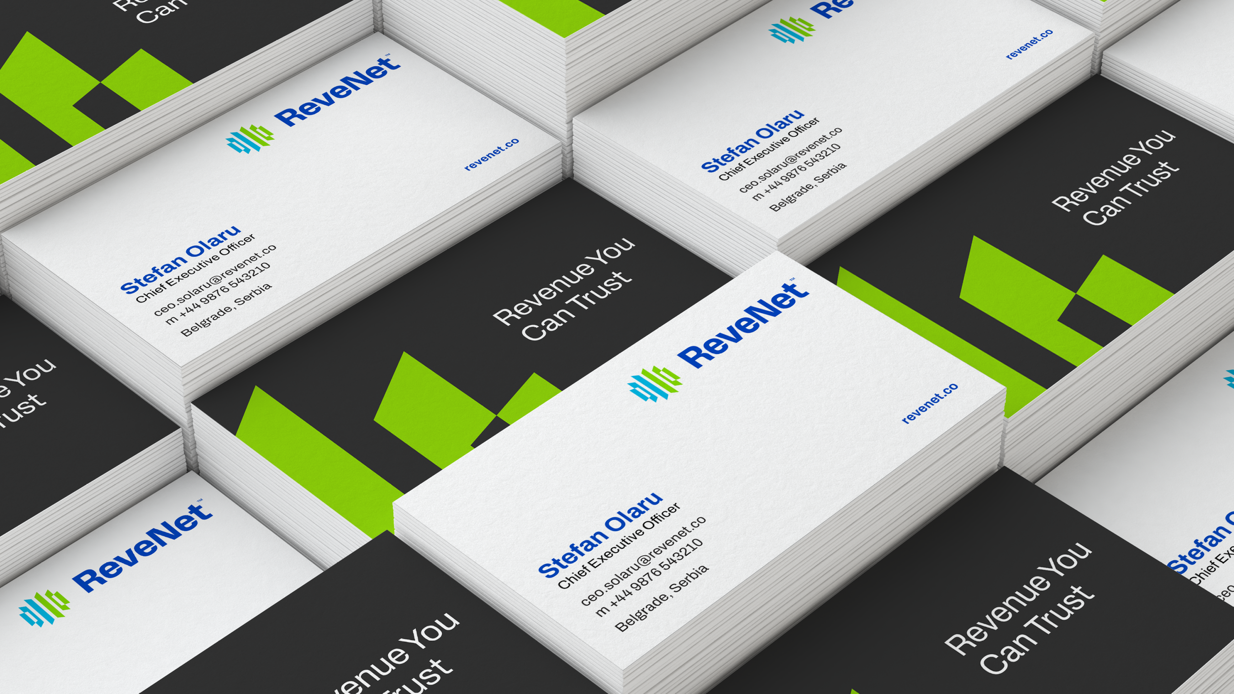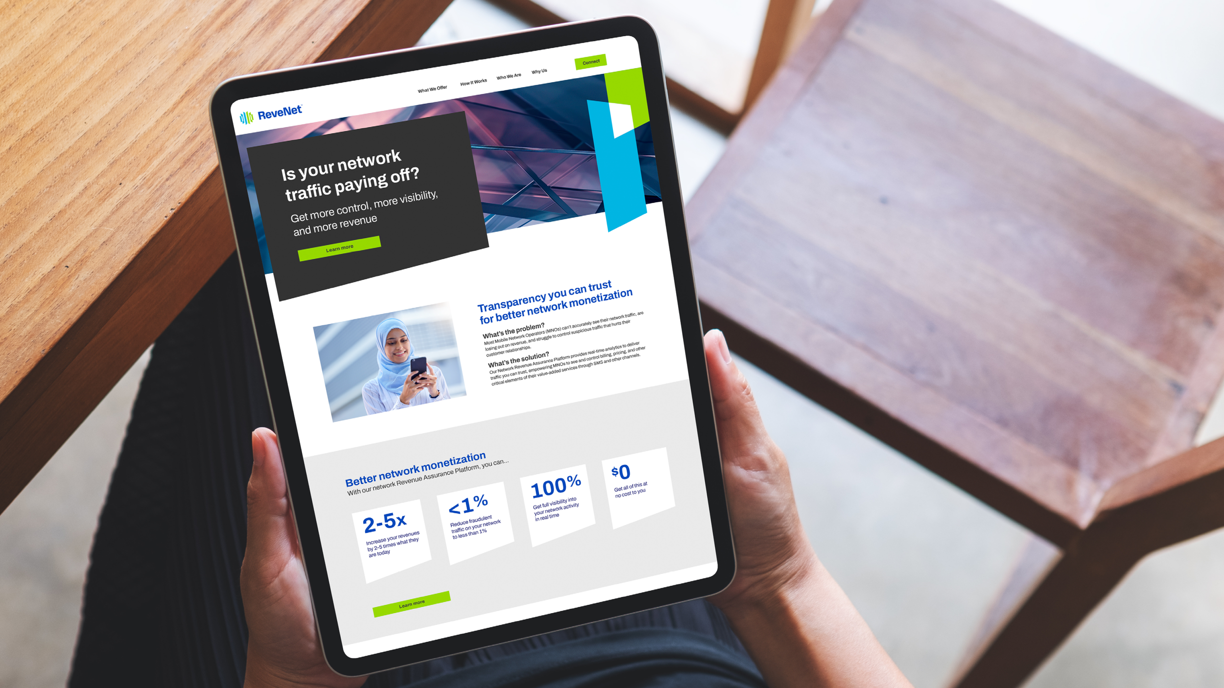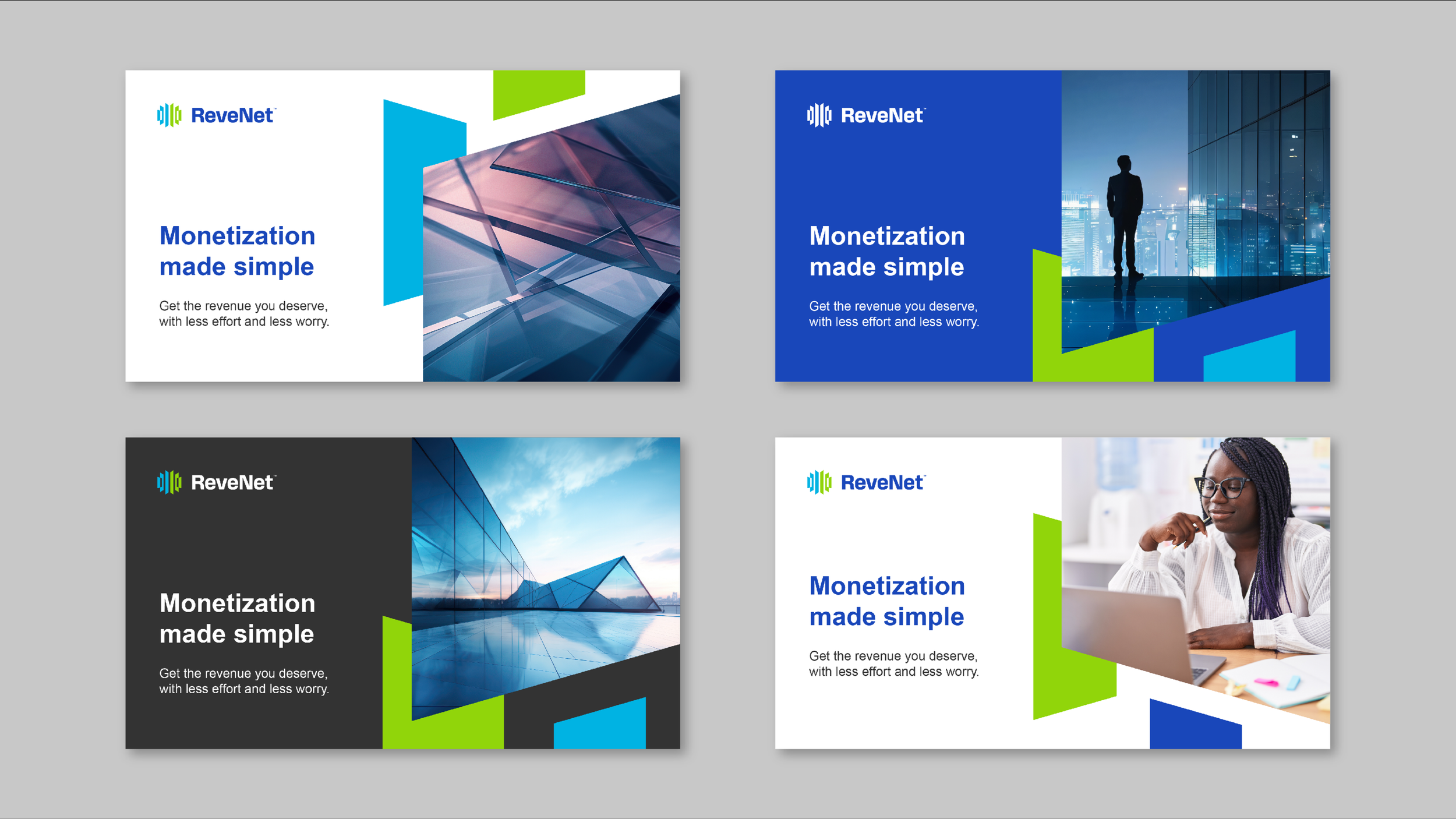 SMS Highway adopted a message platform focused on transparency, solutions tailored to the needs of MNOs, and simplicity. A new name, ReveNet, combined the words “revenue” and “network” and signaled the return of lost revenue to mobile networks. A dynamic, tech-forward logo and visual identity were developed along with a suite of communication tools, including a company overview deck, brand video, digital campaign, and sales materials. Repetition of angles evokes the former SMS logo and emulates scale, revenue and progress.